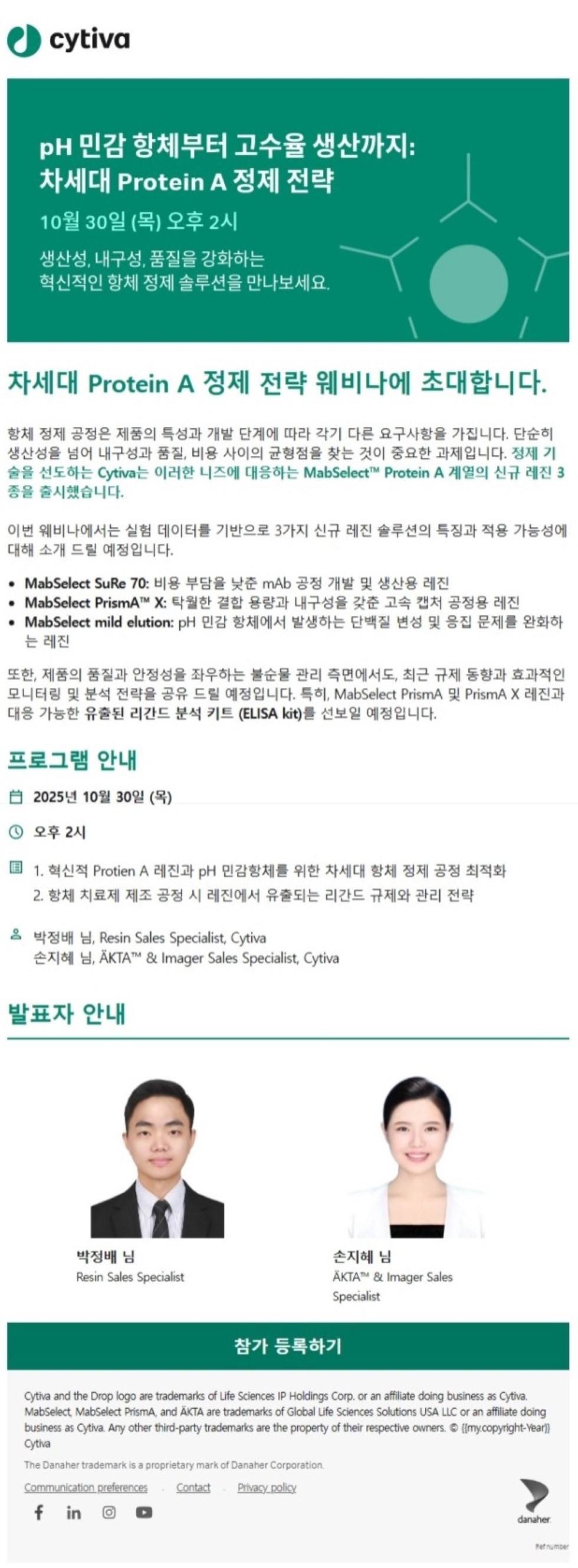 [싸이티바 웨비나] pH 민감 항체부터 고수율 생산까지: 차세대 Protein A 정제 전략