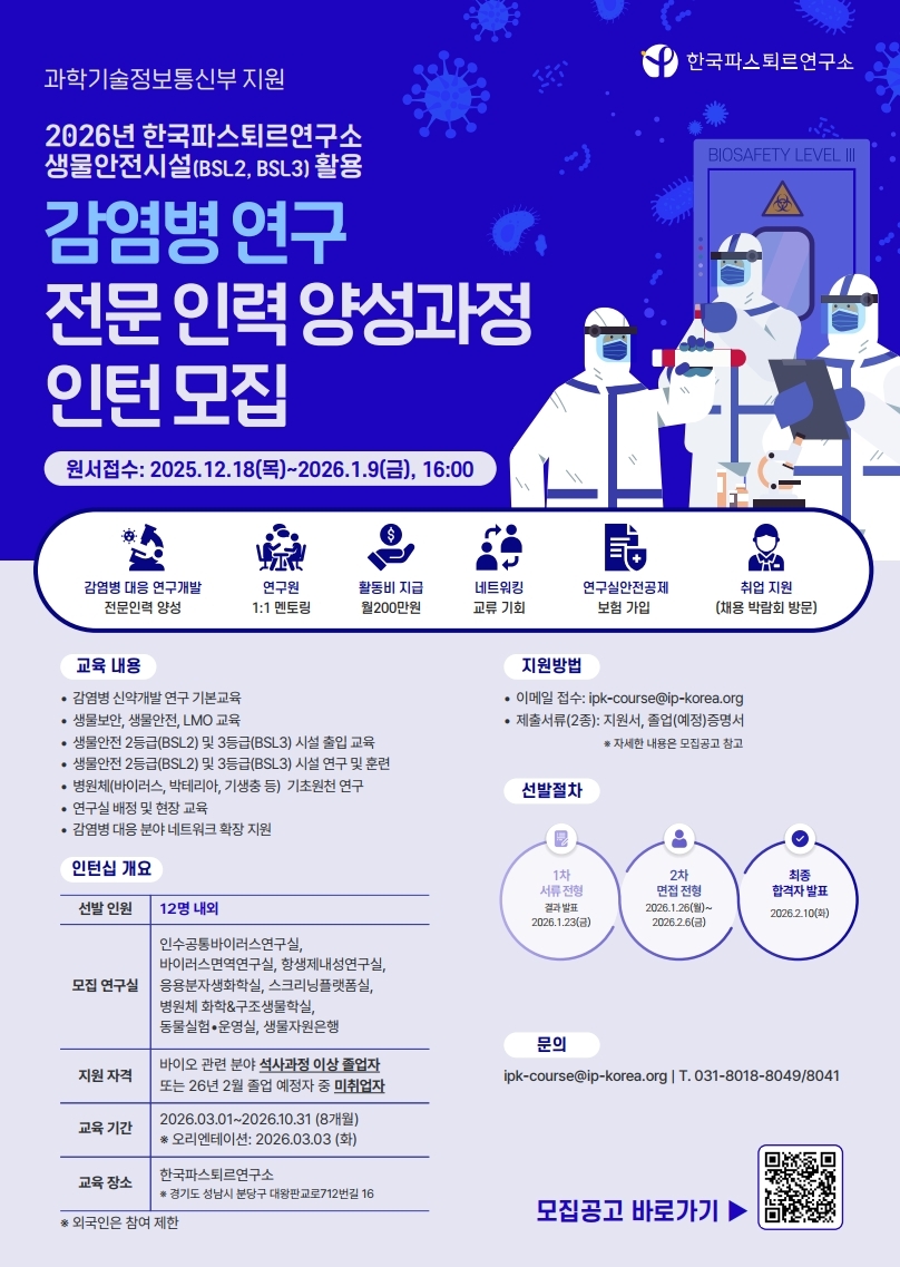 생물안전시설(BSL2, BSL3)활용 감염병 연구 전문인력 양성과정 인턴 모집