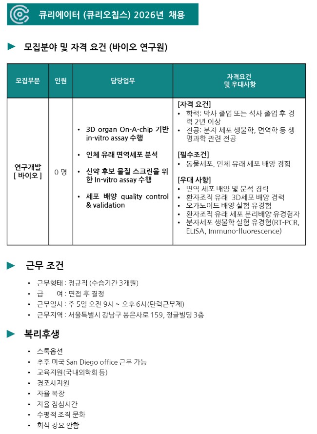 Qureator(큐리오칩스) 바이오 연구원 채용